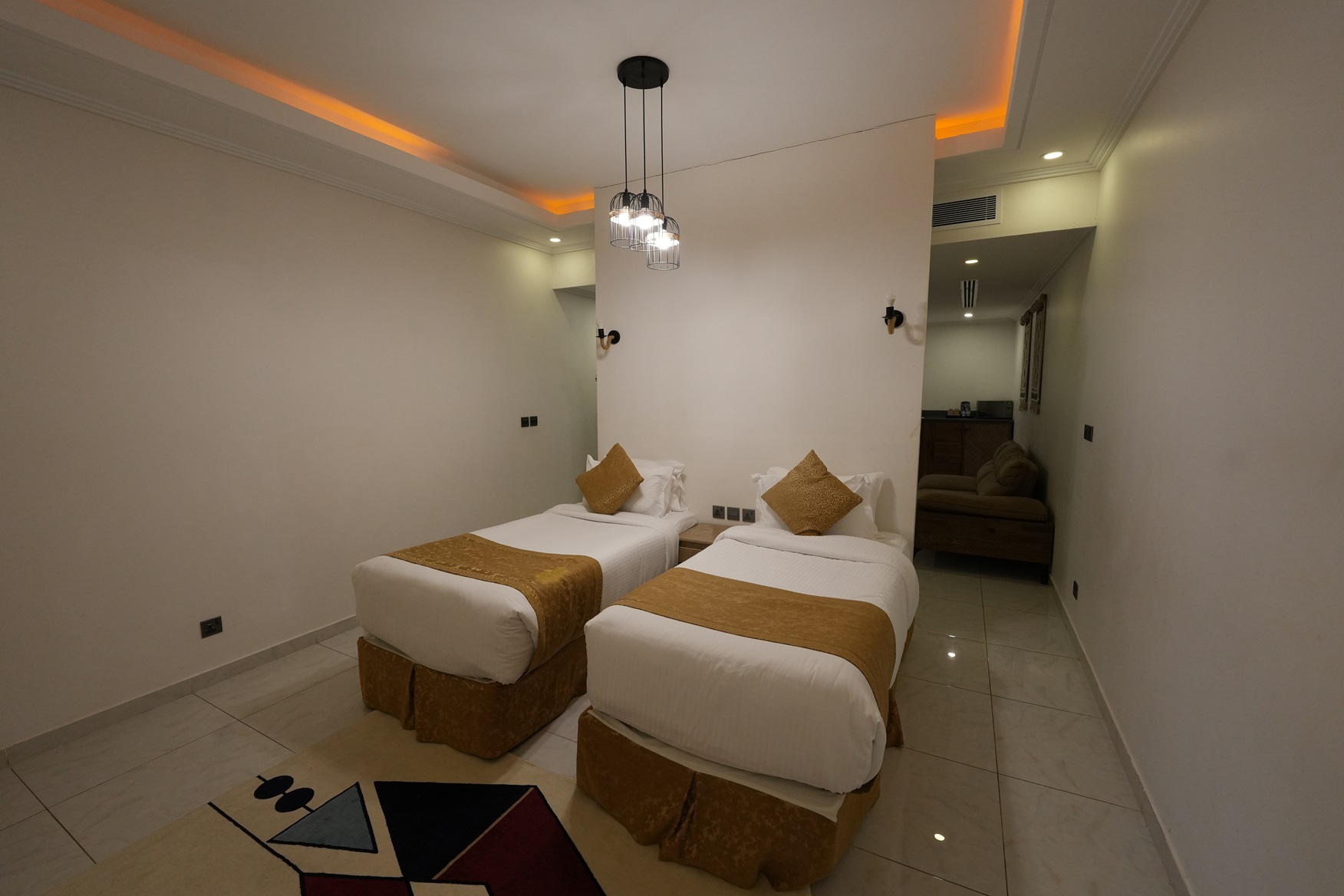 This Family Studio, spanning an impressive 62 square meters, offers a luxurious retreat for up to four guests, blending spacious comfort with refined elegance. This suite features a king-size bed, dressed in premium linens and plush pillows, ensuring a restful experience. A separate sitting lounge adds an extra level of comfort, furnished with a stylish sofa bed that easily converts for additional sleeping space, as well as chic armchairs and a coffee table, perfect for relaxation or casual gatherings.